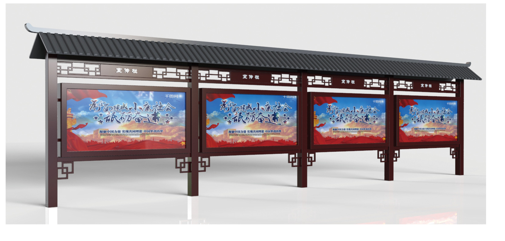 戶外仿古展示欄比較具有中國(guó)傳統(tǒng)文化風(fēng)格。仿古的設(shè)計(jì),能將更多元素融入其中,更好的將自然文化和古文化結(jié)合在一起,為了讓宣傳欄更具有代表性,在不同的場(chǎng)景要有不同的設(shè)計(jì)。